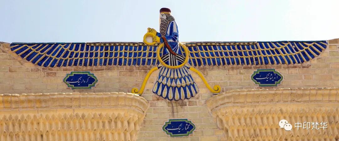 在拜火教庙宇的门楣上,都会有拜火教的标志法拉瓦哈(Faravahar)。关于法拉瓦哈的理解从古至今一直有不同的说法,当今不同地区的拜火教徒也会有一些差异。一般而言,比较公认的标志说明如下: