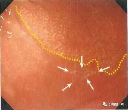 背景为C-2型萎缩粘膜。黄色虚线为萎缩边界(F腺),肛侧萎缩明显,口侧大弯可见三角形褪色区域考虑病变所在。此种褪色病变需要考虑鉴别诊断:1.未分化癌?2.局灶萎缩?3.MALT淋巴瘤?