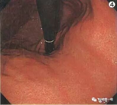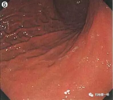 背景粘膜呈C-2型萎缩表现。萎缩领域容易出现分化型癌。胃窦部可见散在多发陈旧性血痂附着(白圈),此为HP阴性或除菌后表现。胃角小弯存在一新鲜出血灶(红圈)明显不同于其他,称为自发性出血。此为提示胃癌的附属表现之一。原因可能因为癌组织较正常粘膜质脆,内镜触碰或者因冲洗等原因而诱发新鲜出血。