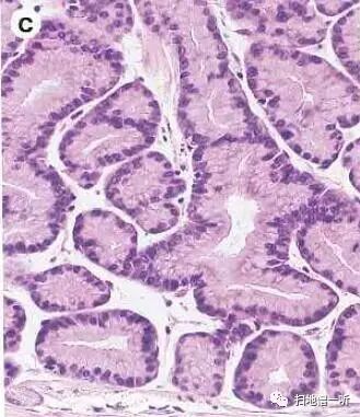 HE染色高倍镜观察可见细胞核类圆形排列于基底侧,胞浆淡嗜碱性,形态类似主细胞。考虑为粘膜内胃底腺型胃癌(主细胞优位型)。免疫组化染色:pepsinogen-I\muc6广泛阳性,H+/K+ATP极少阳性。
