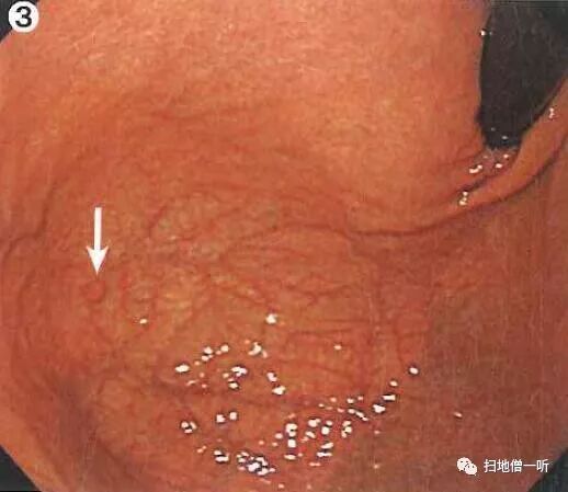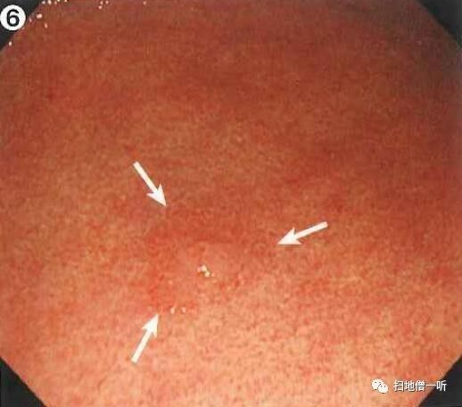 背景粘膜为O-3型萎缩、肠上皮化生、弥漫性发红。胃体下部前壁可见小片粘膜发红,伴毛细血管扩张。毛细血管扩张常常提示癌性病变,需进行详细观察。正面观察时凸凹感不强。