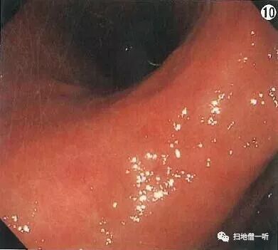 拓展:胃体部胃粘膜水肿状,多发颗粒状隆起,像铺了石子的感觉故称为“铺路石状”粘膜。此常见于HP未感染长期口服PPI者。PPI长期使用致使壁细胞增生所致。故多发性白色隆起称为(春间.川口病)及铺路石样粘膜常为药物所致或既往感染从而提示HP阴性。下图为HP未感染口服PPI十年的患者胃。