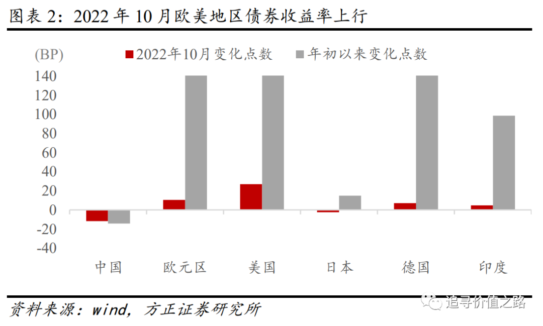 2022年10月欧美地区长期债券收益率多数上行。10月欧元区10年期公债收益率上行10.44BP至2.2391%,美国10年期国债收益率上行27BP至4.10%,德国10年期国债利率从2.12%再次上行7BP至2.19%。同期,中国10年期国债利率从2.7601%下行11.68BP至2.6433%,印度10年期国债收益率小幅上行4.7BP至7.445%,日本10年期国债收益率小幅下行2.4BP至0.253%。![]()