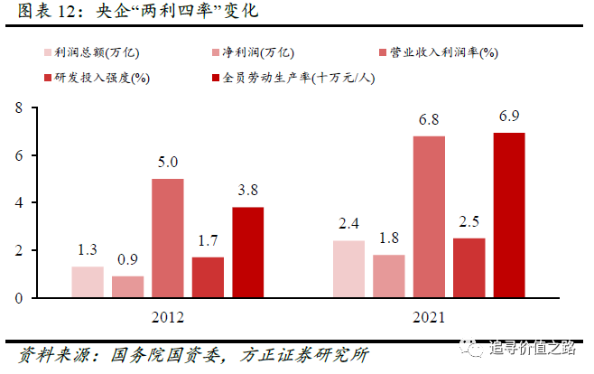 近年来央企业绩稳步提升,有望迎来估值和业绩的双击。在“两利四率”(利润总额、净利润、营业收入利润率、资产负债率、研发投入强度、全员劳动生产率)为主的高质量发展目标管理体系统筹下,央企发展质量显著提升。根据国务院国资委的数据,2012年至2021年,中央企业利润总额从1.3万亿元增长至2.4万亿元,年均增长7.5%;净利润从0.9万亿元增长至1.8万亿元,年均增长7.9%。2021年中央企业营业收入利润率为6.8%,比2012年提高1.8个百分点;研发投入强度为2.5%,比2012年提高0.8个百分点;全员劳动生产率为6.94十万元/人,比2012年增长82%。![]()