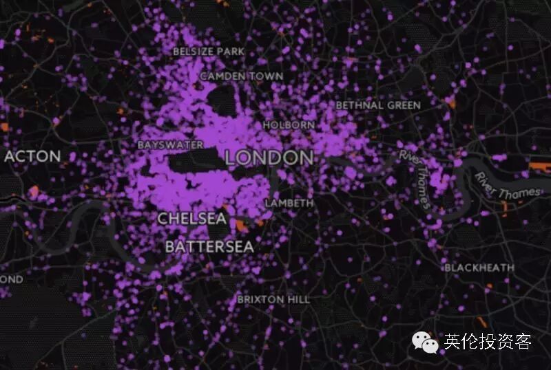 图为由离岸公司持有的伦敦房产地图,紫色亮点代表由离岸公司持有的伦敦房产,可以看到大部分房产集中在伦敦市中心。