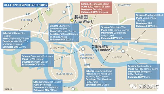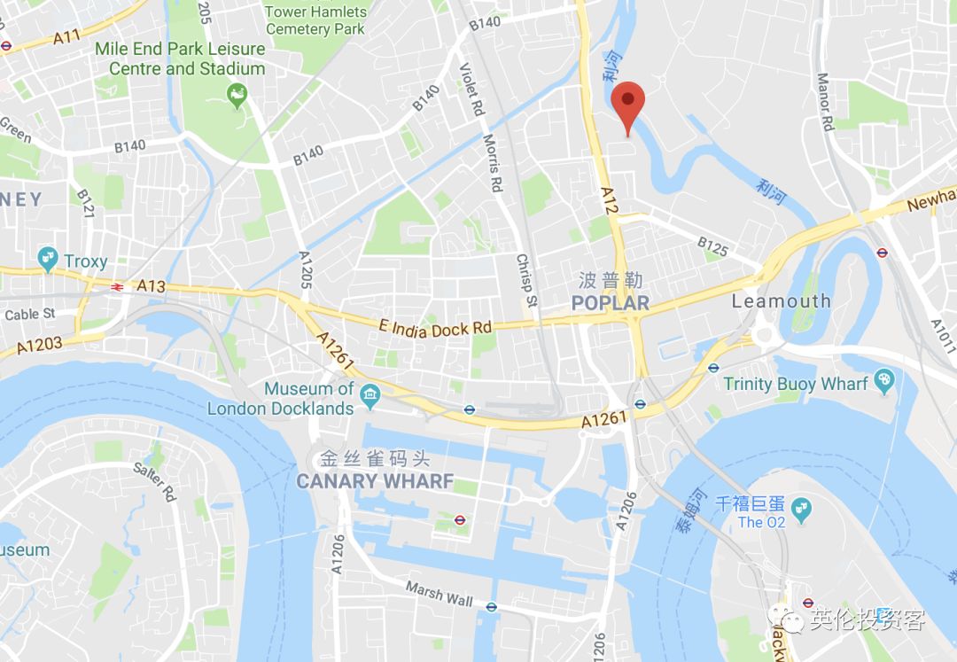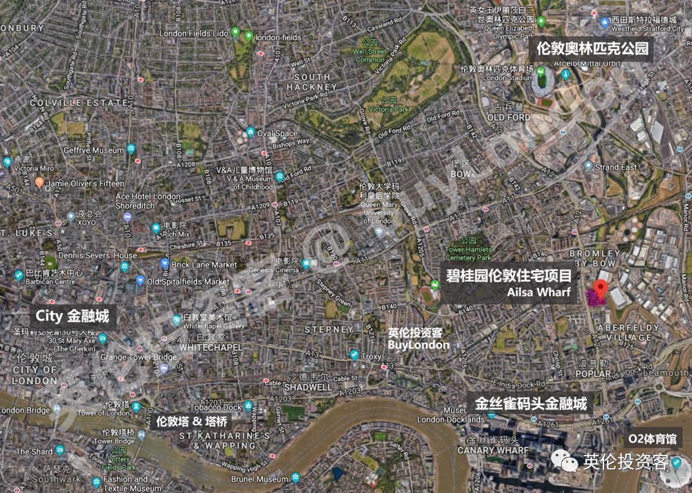 红点为碧桂园Alisa Wharf地块在伦敦的位置