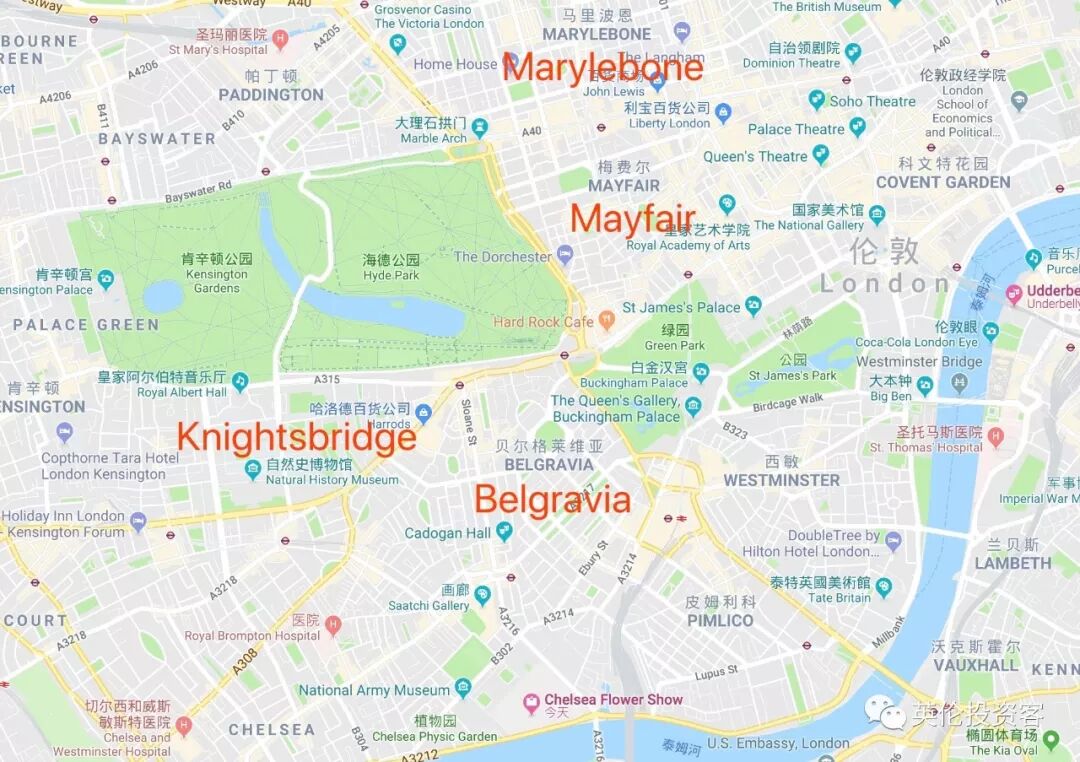 从地段上看,伦敦的超级豪宅主要集中于Marylebone(马里波恩)、Mayfair(梅菲尔)、Knightsbridge(骑士桥)和Belgravia(贝尔格莱维亚)。