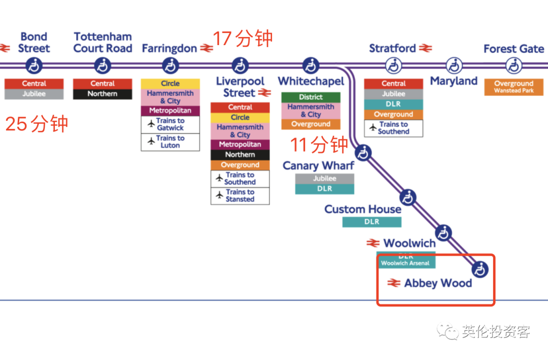 从项目出发,步行即可到达Abbey Wood地铁站,乘坐女王线的话,可在30分钟内快速到达伦敦各大地标: