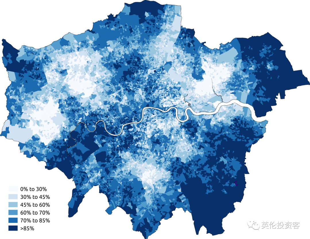 可以看出,白人更多地集中在大伦敦外围,伦敦市中心的白人比例普遍普遍不高。