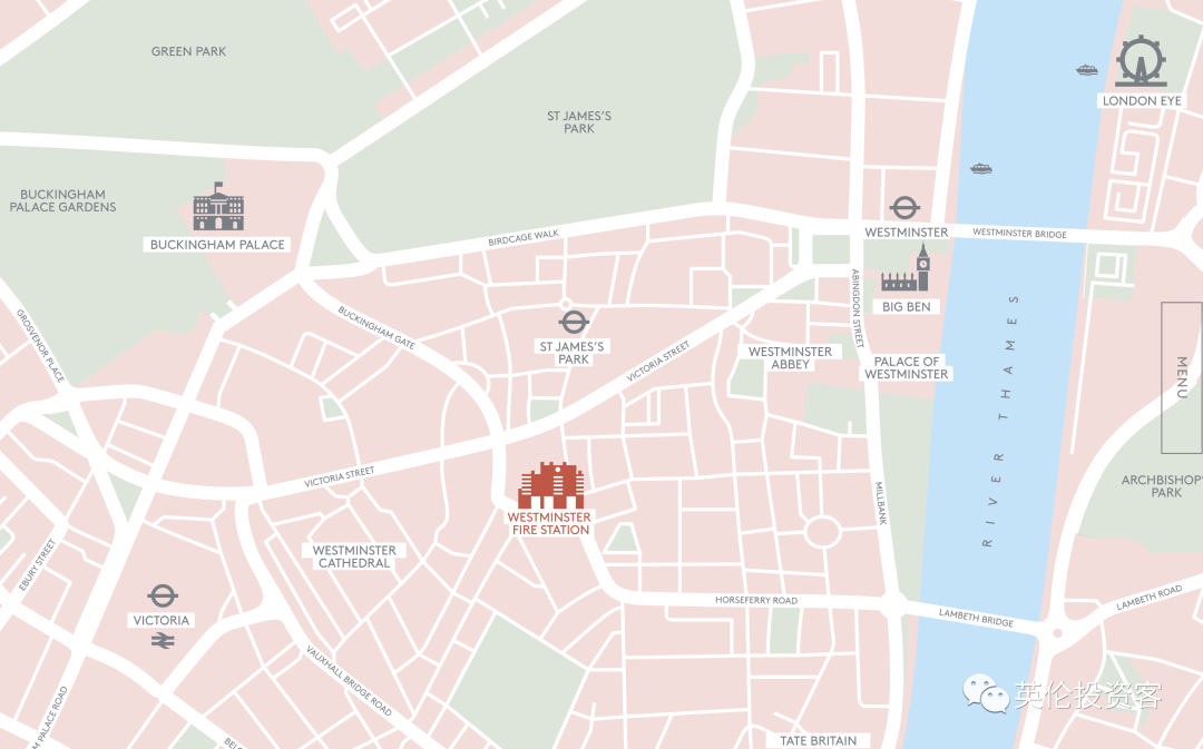 今天介绍的住宅项目名为Westerminster Fire Station,邮编SW1,已于本月正式开盘。项目为现房,全部精装修交付,总价89.5万英镑起,约合人民币740万起。作为位于伦敦Westerminster的二级保护建筑,如下图所示,从项目出发,走路11分钟即可到达白金汉宫,步行13分钟可达大本钟,属于伦敦真正的绝版地段。项目具体邮编为SW1P 1SB,在谷歌地图上的具体位置如下👇