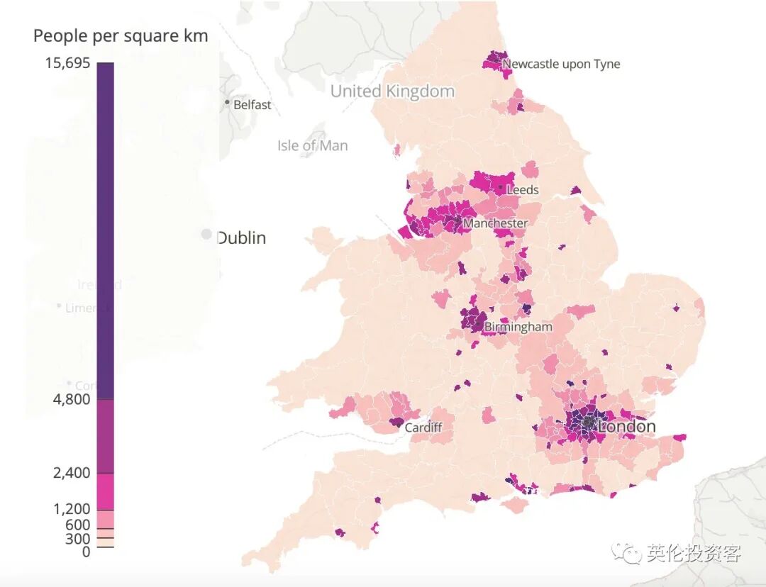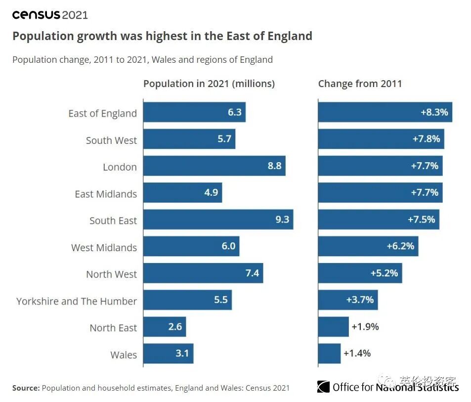 英格兰和威尔士两地人口总数达到5959.73万人。如果加上已公布的北爱尔兰人口数据(190万)和苏格兰2020年的人口统计(547万),英国总人口目前为6696.64万人,创下了英国有史以来最高的人口记录。2. 英国增长分布非常不均,东伦敦Tower Hamlets增速排第一人口普查数据显示,英格兰和威尔士两大地区人口的增长在这十年期间并不均匀。从地区方位来看,人口增长最快的是英格兰东部,自2011年起增加了大约48.8万人,增幅8.3%;其次是西南部(人口增长7.8%)和大伦敦(人口增长7.7%)。威尔士的人口增长幅度最低,仅为1.4%;英格兰东北部地区的人口增长率为1.9%。![]()