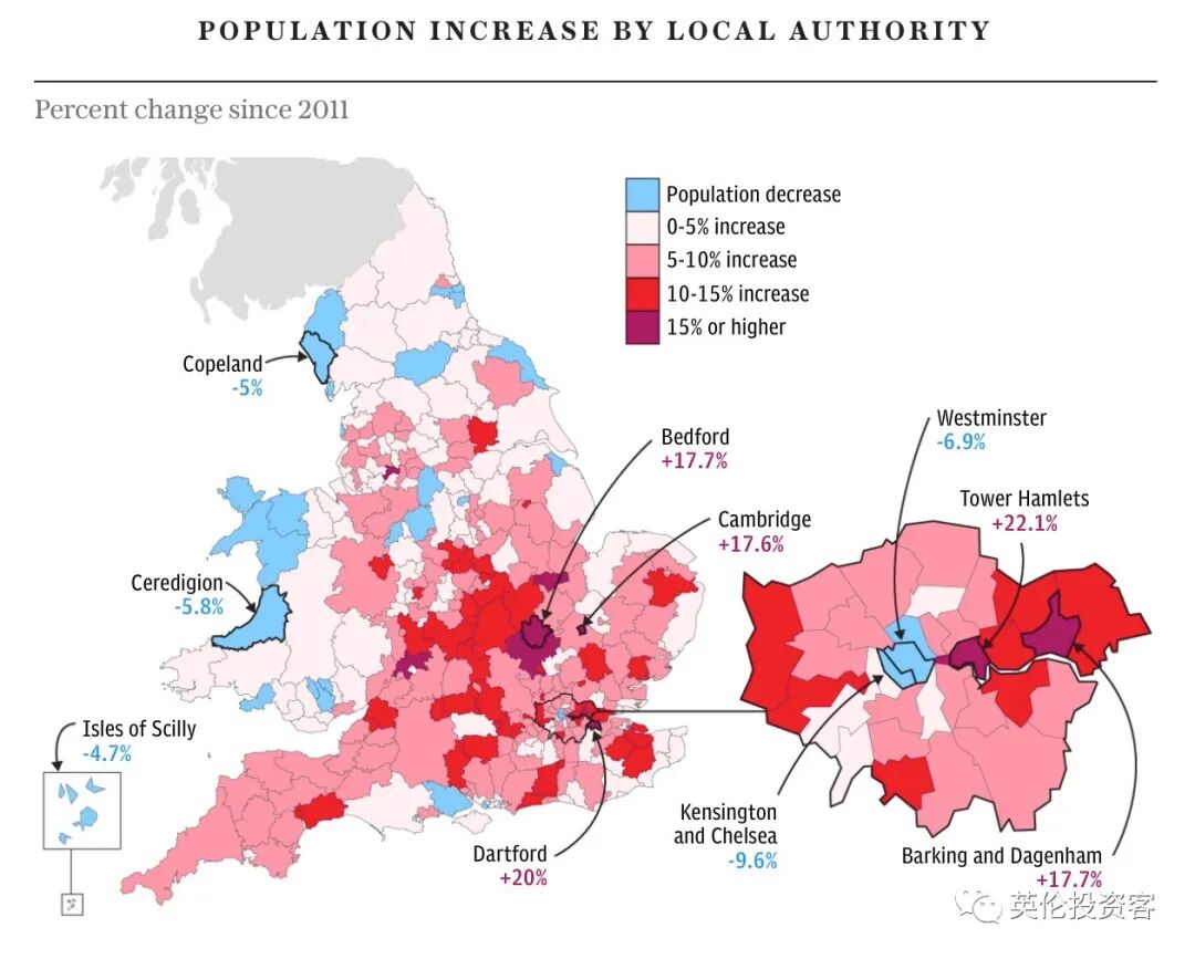 如果细化到各区的话,全英人口增长最快的地方是位于东伦敦的Tower Hamlets,人口增长了22.1%。过去二十年经历了飞速发展的金丝雀码头金融城就位于Tower Hamlets。- 东伦敦Barking and Dagenham (涨幅17.7%)