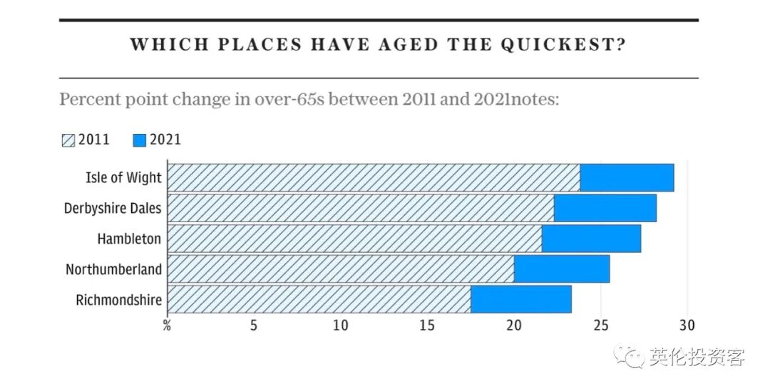 2011年至2021年期间,65岁以上人口比例增长最快的地区有:- 德比郡的Dales,比例从2011年的22.3%增长到2021年的28.2%;