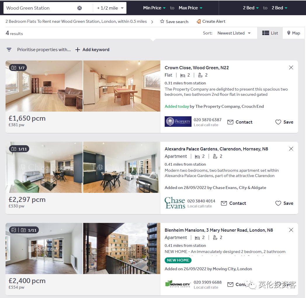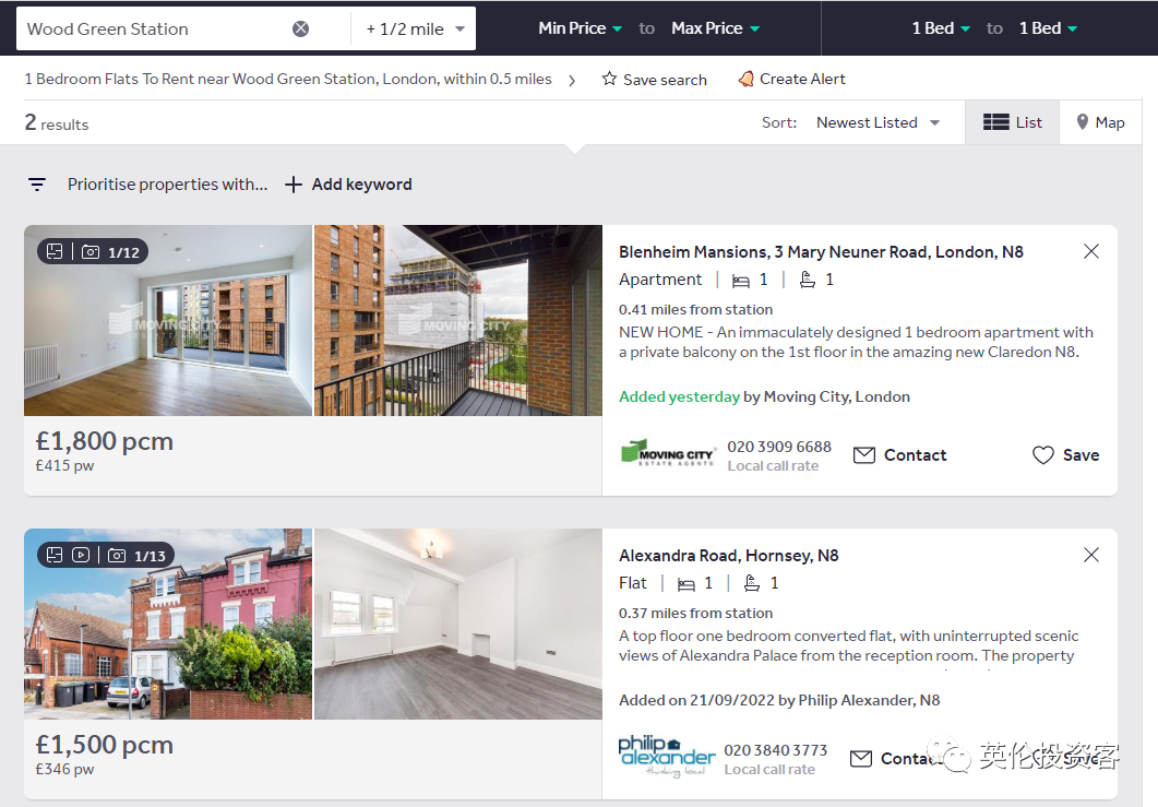 Rightmove显示一房仅剩2套,租金分别为每月1500英镑和1800英镑,可见市场非常火爆;二房市场上仅有4套,租金约每月1650-2400英镑左右。