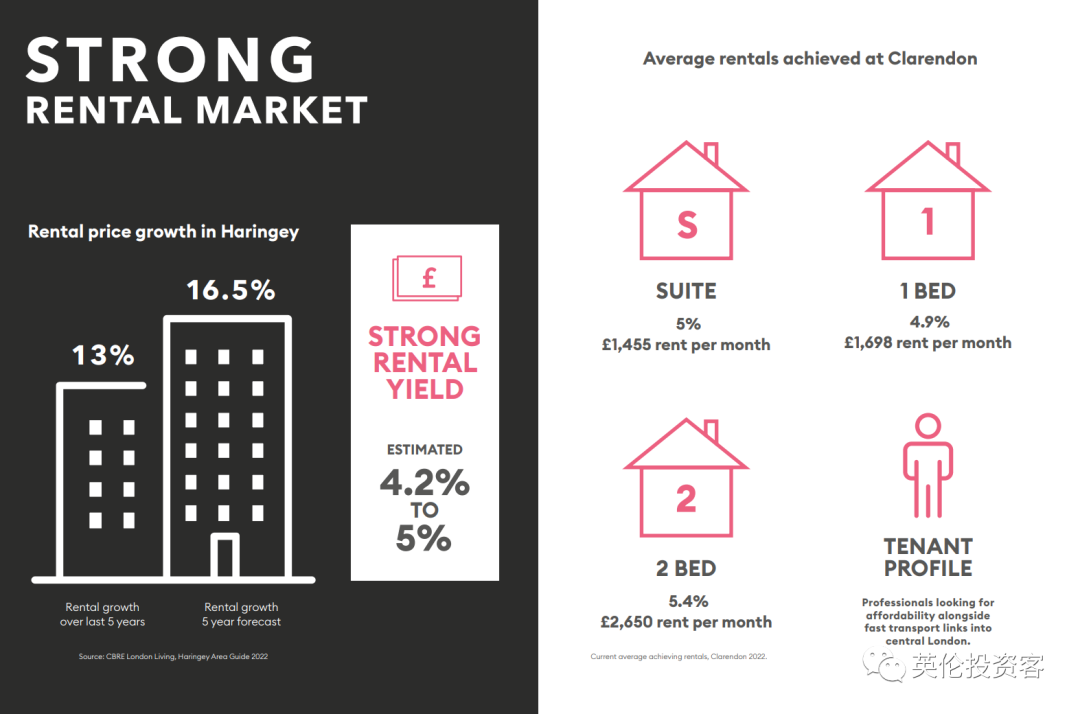 按照该项目一房平均月租金1698英镑估算,两房平均月租金2650英镑估算,项目租售比在4.2-5%。