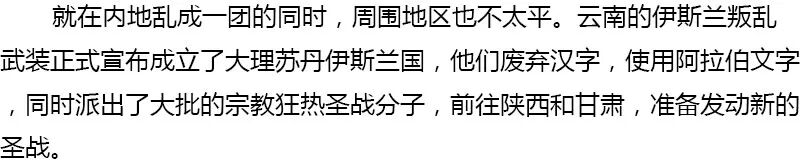 同样很多人也不知道,大清帝国为什么急着禁烟?一般以为是鸦片的流入导致白银外流,这的确是一个重要原因,但这并不是唯一的原因。还有一个同样重要的原因不得不被提及——在新疆地区,阿拉伯传教士掀起的一场又一场的宗教战争,耗空了清朝的国库。这些战争的真相从来没有被传统的历史书记载。