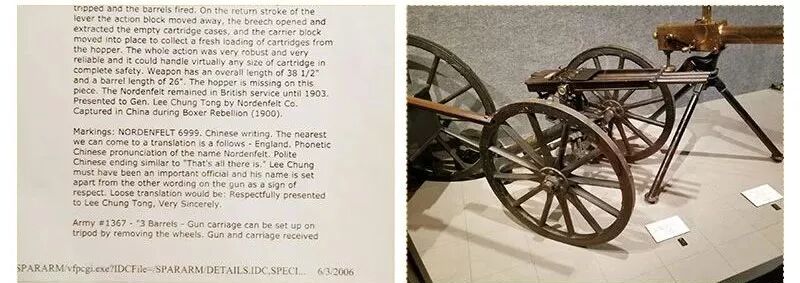 事情的起因是这样的,我最近在美国著名的春田兵工厂的博物馆里,发现了一挺诺顿菲尔特速射机关枪,枪身上写:“英吉利,诺顿菲尔特,敬赠李中堂”。旁边附说明:此枪在1900年,八国联军侵略天津时缴获,此战役中共缴获清军这种机枪上百把。