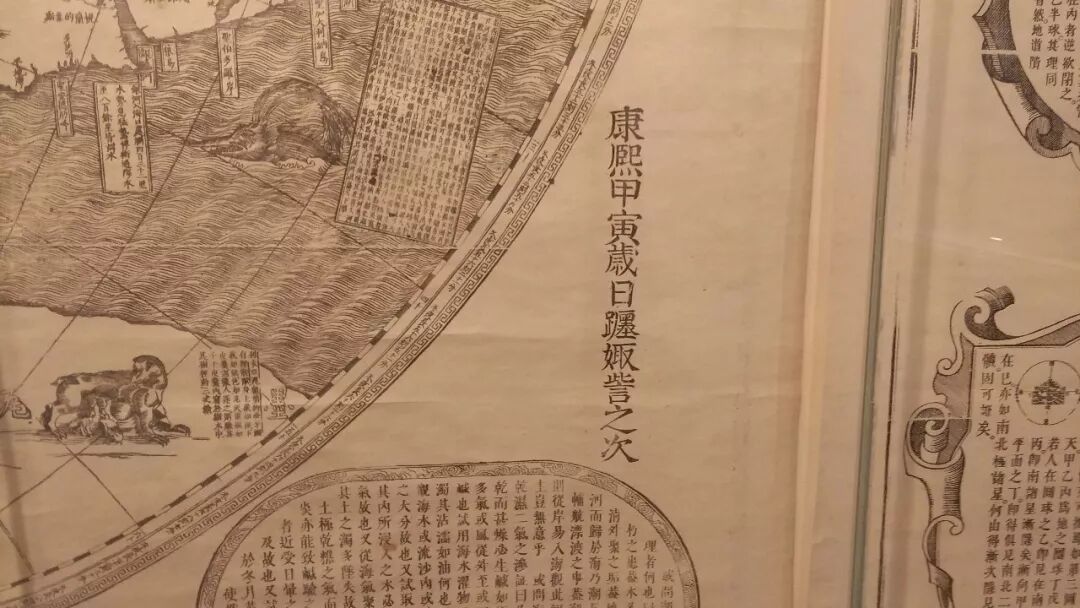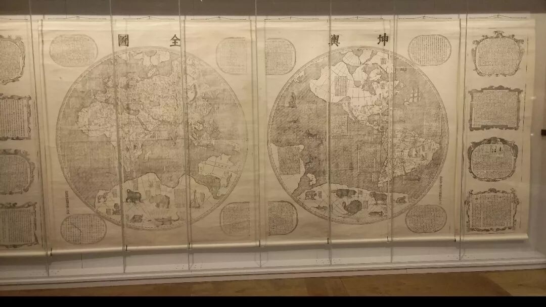 这副名叫坤舆全图的世界地图全用中文标注,由比利时耶稣会传教士南怀仁制作并献给了康熙皇帝。除了比例尺略有不准以外,和我们今天所看到的世界地图几乎没有什么区别,清清楚楚的标示着四大洲五大洋,甚至还有南极北极,以及当时世界上主要的国家,及一些文字说明。