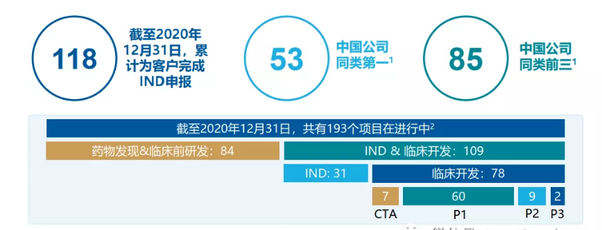 而根据药明康德国内新药研发服务部(DDSU)相关数据显示,截至2020年末,公司累计完成118个项目的IND申报工作,并获得87个项目的临床试验批件。截至2020年12月31日,有2个项目处于III期临床试验、9个项目处于II期临床试验、60个项目处于I期临床试验。