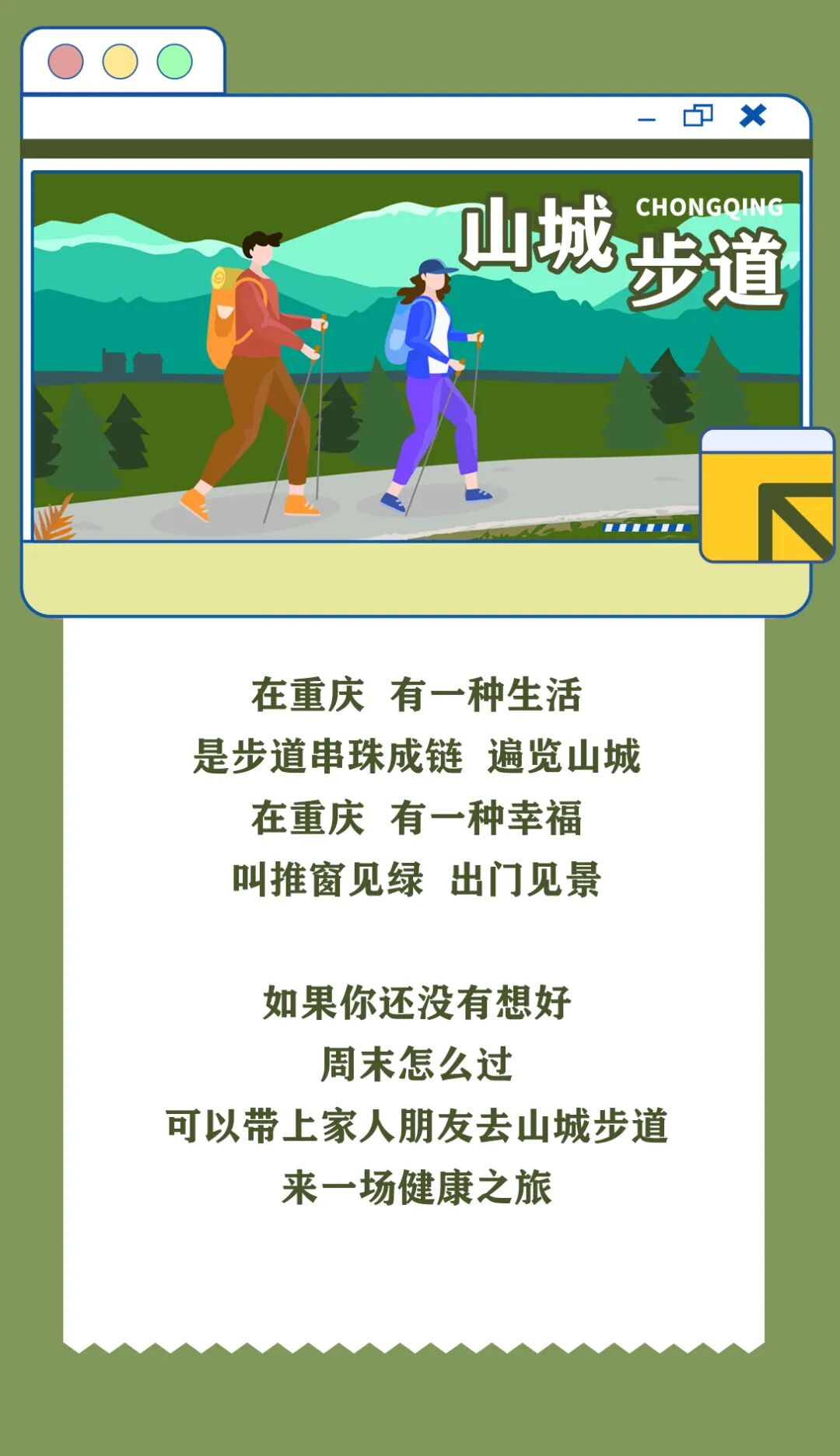 位于重钢崖线上,全长约22公里。该步道将老工业区与山城的特色相结合,将骑行、步行贯通于一体,是中心城区首条“崖线上的有氧跑道”。