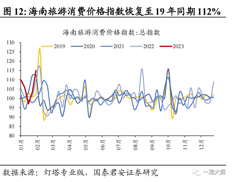 服务消费继续修复,提价逻辑仍在演绎。酒店RevPAR/OCC/ADR恢复至19年同期的94%/81%/116%;春节-元宵全国电影票房较22年同期变化+15.7%,约为21年史上最强春节档同期的93.6%;海南旅游消费价格指数周环比变化+11.4%,恢复至19年同期的112%。