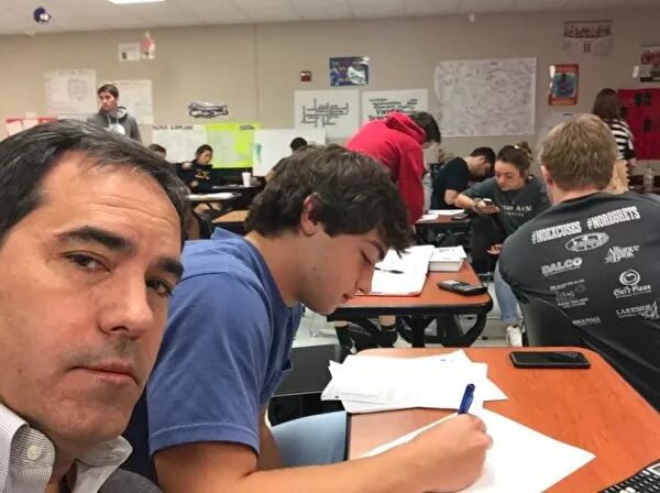 老布拉德早早来到教室,坐在儿子的座位上。坐在一群高中少年中间,他坦承有点紧张,“进入这样的情境我还没做好心理准备”。