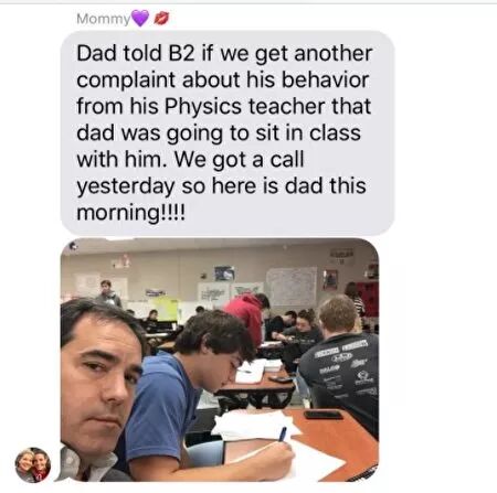 小布拉德的妹妹莫莉(Molli Howard)将照片上传推特,调侃地写道:“我爸告诉我哥,如果他再接到物理老师的投诉他就去坐在他班上……我爸又接到电话了,于是他早上就坐在那了!!!”