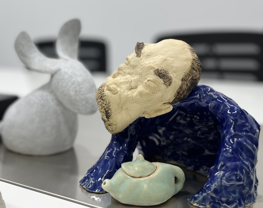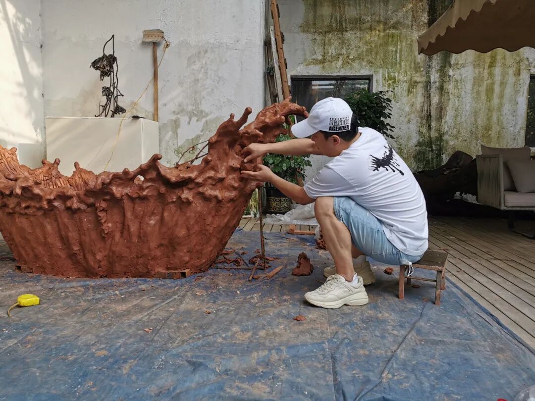 这个作品英文名叫“Breaker”,意思是“破坏、打破、巨浪冲击”,就像一个平静的水面遭到了外来物体的冲击,瞬间激起了浪花。作品将这一瞬间凝固了下来。当人在浴缸中时,人就是那个“外来物体”。所有事件,我们都是亲历者,也都是参与者。我发现每次有大块的时间可以深入创作,都和乌尔善导演有很大的关系。第一次是拍他的《寻龙决》,第二次是拍《封神》。这些特效大片,镜头中间换光、换景,可能就需要两三个小时。因为道具设计的需要,剧组也有很多雕刻师和能工巧匠,我就从他们那里借点雕塑泥,拿点工具,没事就自己尝试着做,慢慢地就做开了。前不久去深圳拍戏,因为疫情的缘故,三个月的戏拍了五个月,于是有了很多空余时间,我就去拜访岭南当地的一些艺术家。石湾是中国的陶都,有很多代表性的艺术家,我去了曾黎、曾鹏老先生的工作坊,他们70多岁了,还戴着围裙天天做陶瓷,我看了非常感动。从事演员职业,除了睡觉,几乎一直处于热闹的氛围里。电影前期要和编剧、导演、服化道、摄录美打交道,到了宣传期,旁边也跟着一堆人,乌乌泱泱的。只有做泥塑的时候,我终于有了一个和自己聊天的过程。这有点像长跑,完全进入到了自己的世界,不需要顾忌别人的意见,可以完全按照自己的想法。做坏了我可以砸了它,或者我就喜欢坏的样子,裂了有裂了的美感,不用顾忌市场和舆论,不用被评判。黄渤做“激浪”的过程
