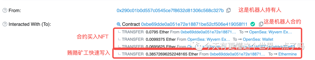 到这里没有头绪了,我们再从交易记录中再找找线索,我们打开其中一个操作看到是在同一个区块的同一个交易中,机器人从两个人之间完成了低买高卖的行为。