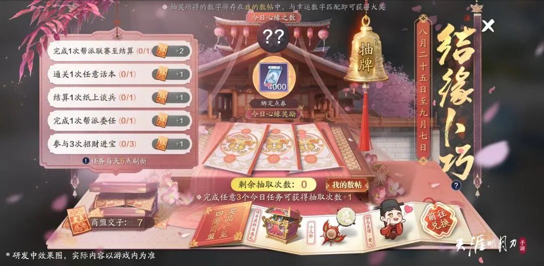 每日完成任意三个任务即可获得一次抽取数帖的机会(每次抽取数贴均有机会获得额外的商盟交子),只要当前拥有的任一数帖与当日心缘之数一致,即可获得4000绑点大奖!