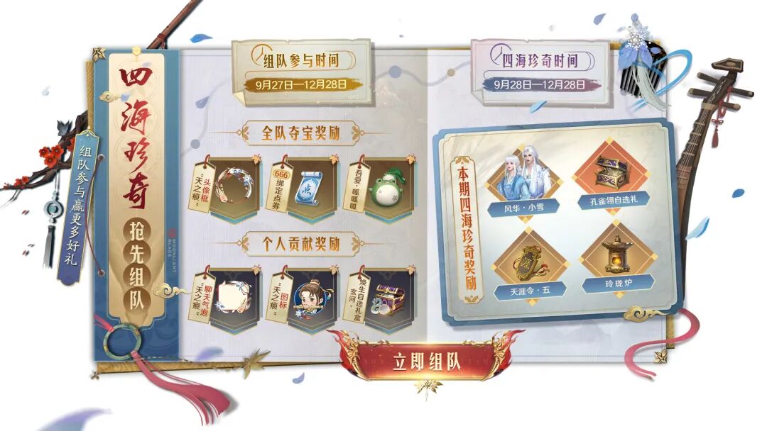 四海珍奇活动即将开启!抢先组队活动将率先于9月27日15:00开启,组队参与夺宝,达标则全队有机会领取无门槛奖励!