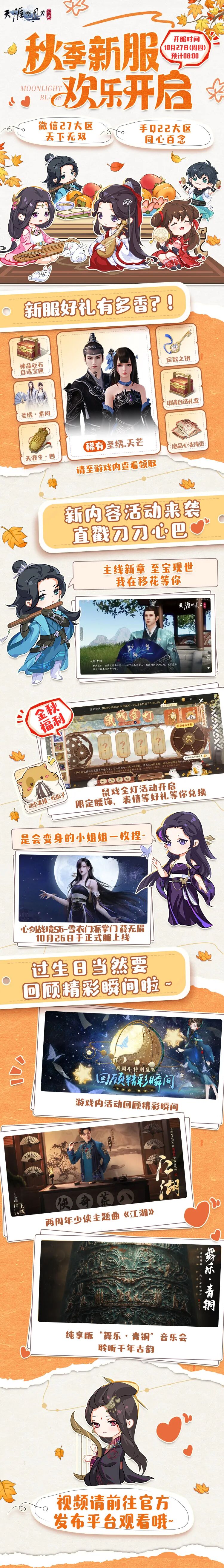 最后还有新服情报送上!10月27日(周四)刀刀秋季新服将至,期待与少侠在秋意正浓的美好时刻开启全新江湖旅程~