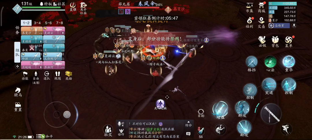 举个例子,假如BOSS头顶显示“暗伤抗性提升”,那我们就需要变身为队伍中的太白、五毒等会心门派,才能对BOSS进行有效输出。
