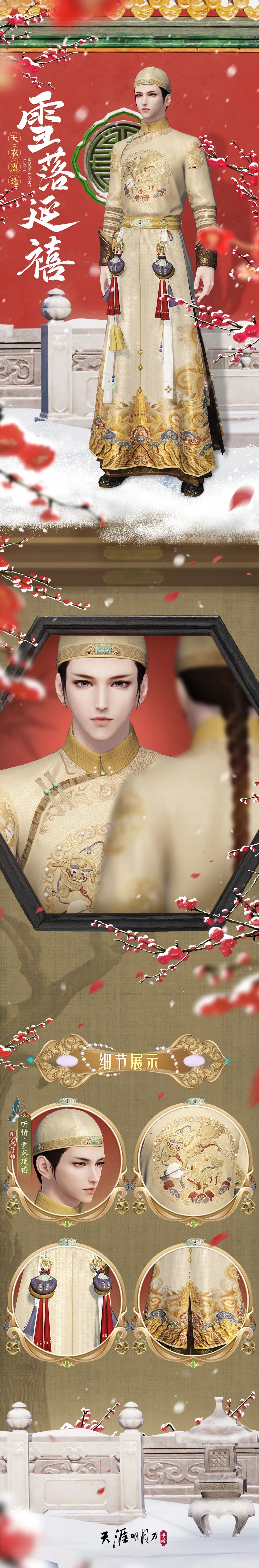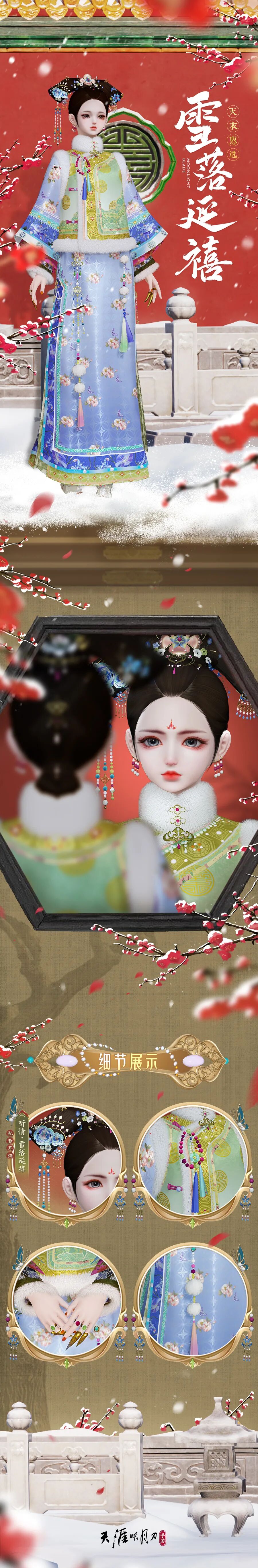 全新外观雪落延禧将在更新后的天衣惠选系统中开放兑换,外观以清代旗装为灵感,女款湖绿色的旗装广袖长袍绣纹细节满满,雍容典雅。少女款还有茸茸镶边,可爱灵动。男款窄袖筒身,蹬皂靴,玉带束腰,集烨然贵气于一身。