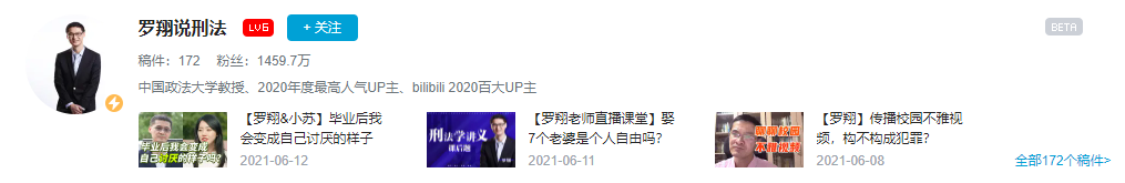 2020年3月9日,罗翔在B站发布第一条视频,此后他粉丝两天超过100万,半年之内破500万,时至今日达到了1400万的恐怖数量。