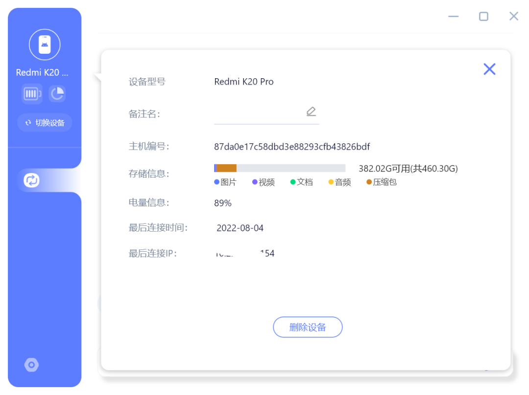 与手机连接成功之后,还会在电脑上展示手机的电量,存储占用等情况,连接电脑的话,信息要少一点。