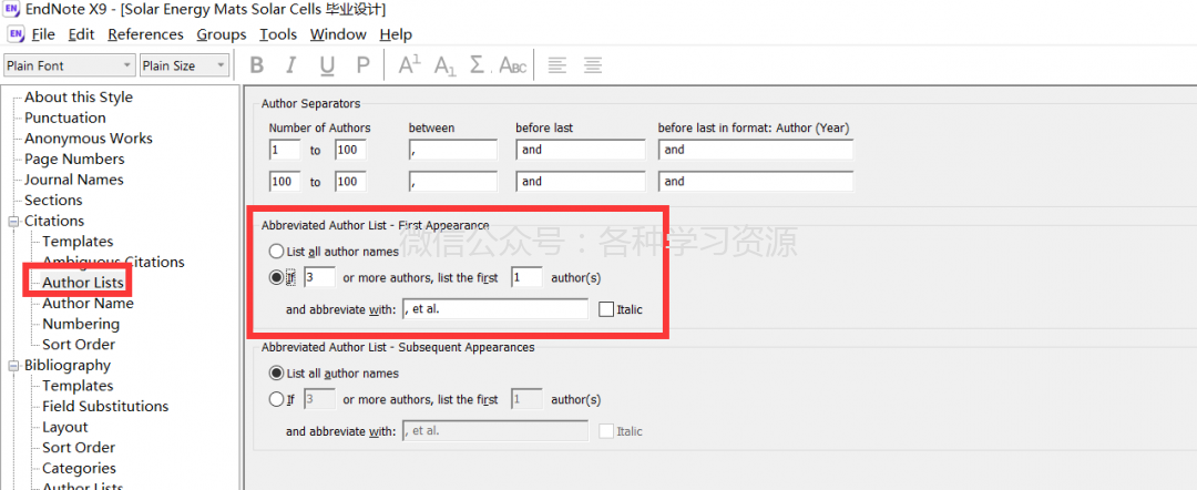 一般期刊或者毕业论文会要求列出的作者数量,这时点击citations --author name list,然后根据要求列出的作者数量设置。