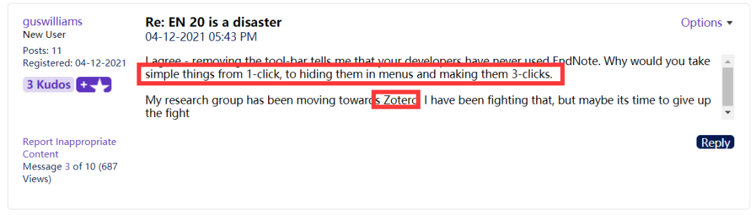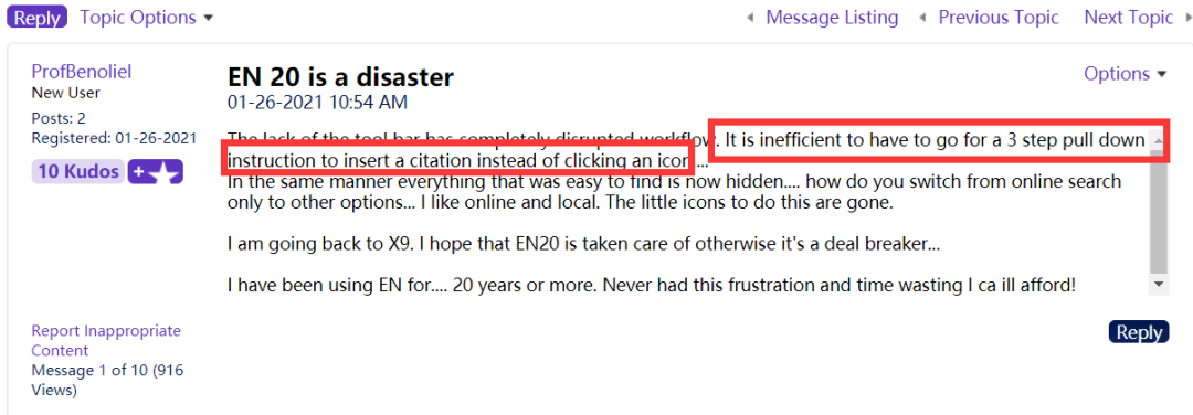 自从去年10月更新全新版本后可以说没有得到一位用户称赞,从EndNote社区评论了解到,20版本让一位自1997年就开始使用的资深用户苦不堪言,并表示后悔更新20版本。