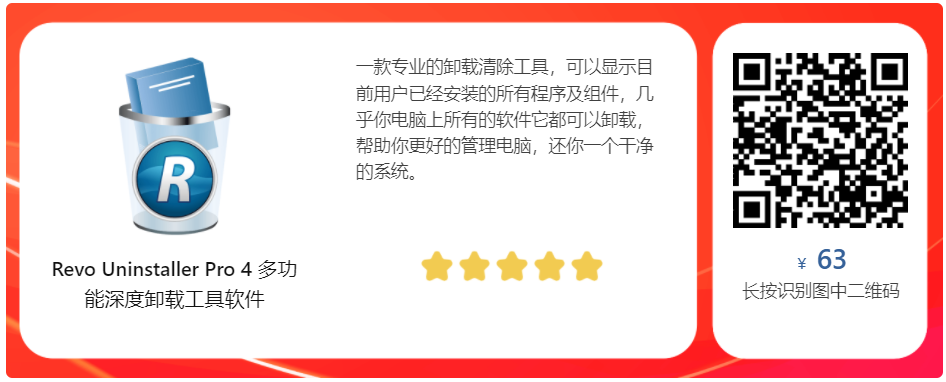 Revo Uninstaller Pro 一款强大的卸载程序,可帮助卸载不必要的软件并轻松删除安装在个人计算机上的有害程序Revo Uninstaller Pro可以更方便地优化设备,并摆脱不需要的所有程序文件并提升计算机性能。可以将文件完全删除,诸如注册表项或程序文件和文件夹之类的痕迹可能仍然保留,使用Revo Uninstaller Pro,可以确保清除系统中的残留物,并为设备提供更多的舒适感和优化效果。此软件目前终身授权版,长按扫码或点击文末阅读原文链接购买最低只需63元即可获取,此外还有免费版分享!