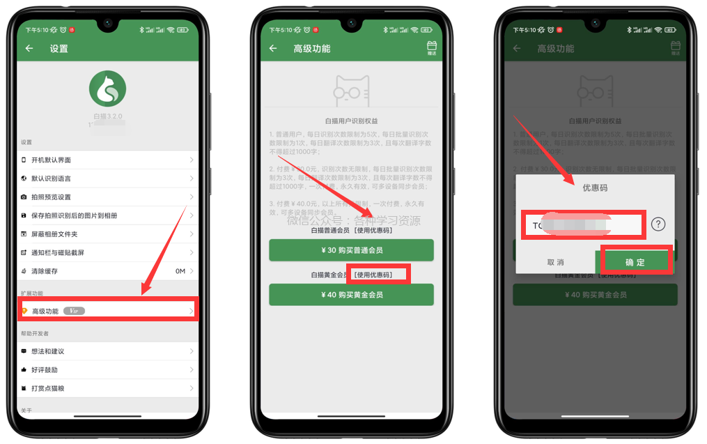 在手机上打开白描 APP 软件,左上角点击齿轮图标 –> 高级功能 –> 使用优惠码,输入购买的激活码点击确定即可。