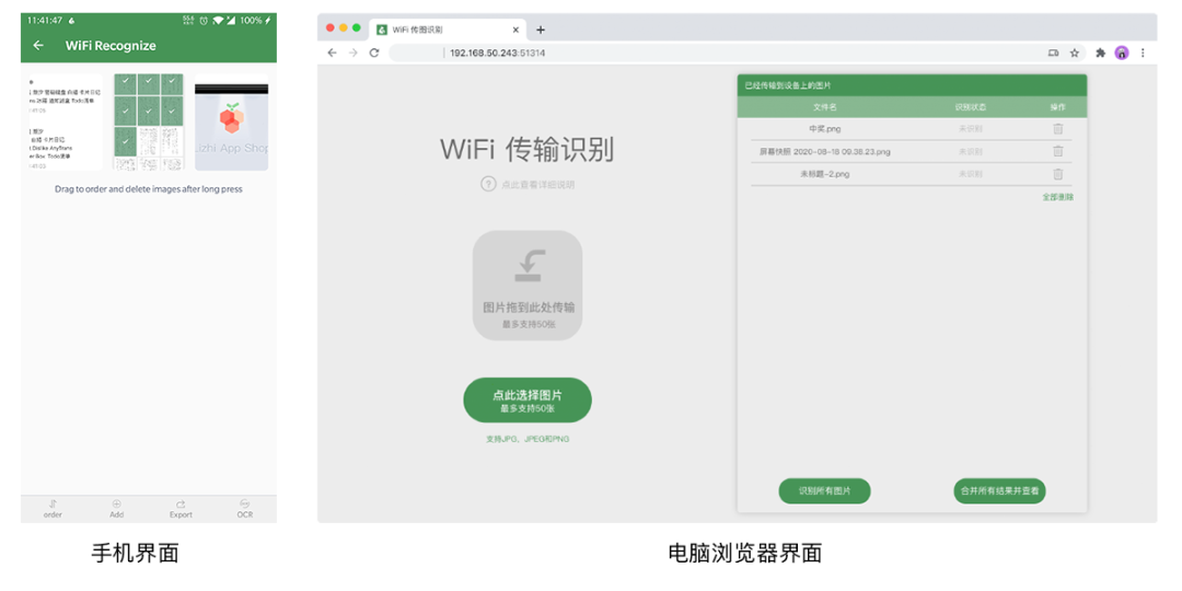 手机和电脑连接同一 WiFi,点击白描 App 首页右上角的 WiFi 传输,按提示在电脑浏览器中访问指定地址并配对即可。
