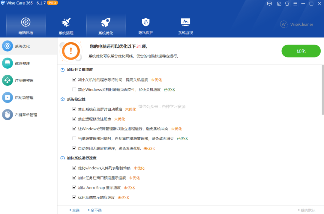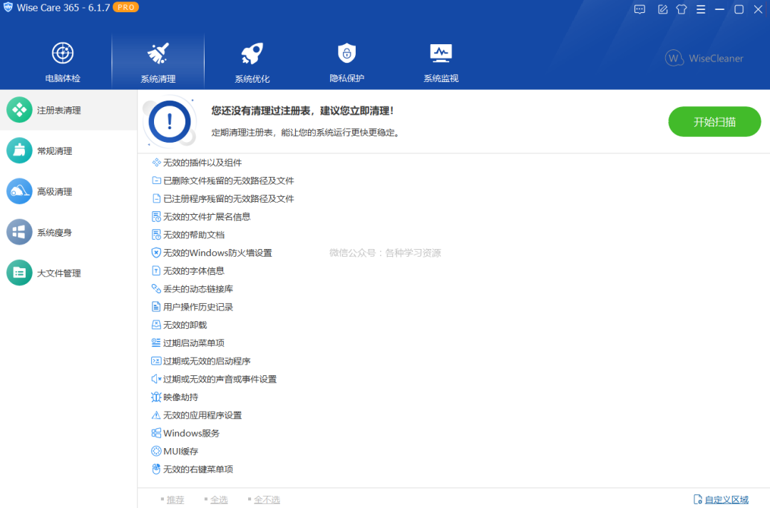 推荐一款清理注册表和磁盘垃圾文件、保护个人隐私记录、提高电脑使用安全的工具--Wise Care 365 Pro。Wise Care 365 是数十亿希望将其 Windows PC 保持在最佳性能的 Windows 用户的首选选项。它删除无效的 Windows 注册表项并清理无用的文件、下载历史记录、浏览历史记录、无效的快捷方式、痕迹、缓存、cookie、密码、Windows 组件和具有特定扩展名的文件 - 使 Windows 系统运行得更快并释放更多宝贵的硬盘空间。它还为高级用户提供了可定制的清洁选项。提高Windows 电脑速度的同时保障安全及系统稳定-让你的电脑时刻保持巅峰状态。