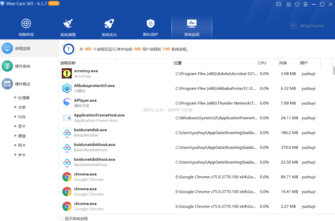 系统监视提供进程监视,还有硬件概述功能,可以让你了解你的电脑信息。