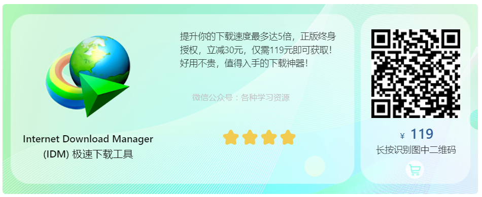 小编目前提供IDM正版授权,终身授权立减30元,仅需119元;一年授权版立减10元,仅需39元。长按下方扫码或点击文末阅读原文链接,即可购买!