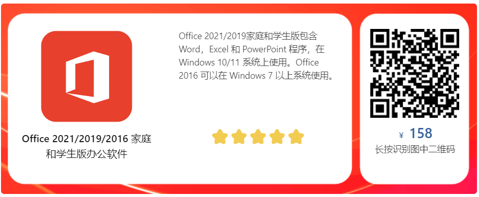 长按下方图片扫码进入购买页面,专属优惠链接购买最高立减200元,其中Office 2016立减100元,仅需158元;Office 2019立减100元,仅需198元;Office 2021立减200元,仅需398元。
