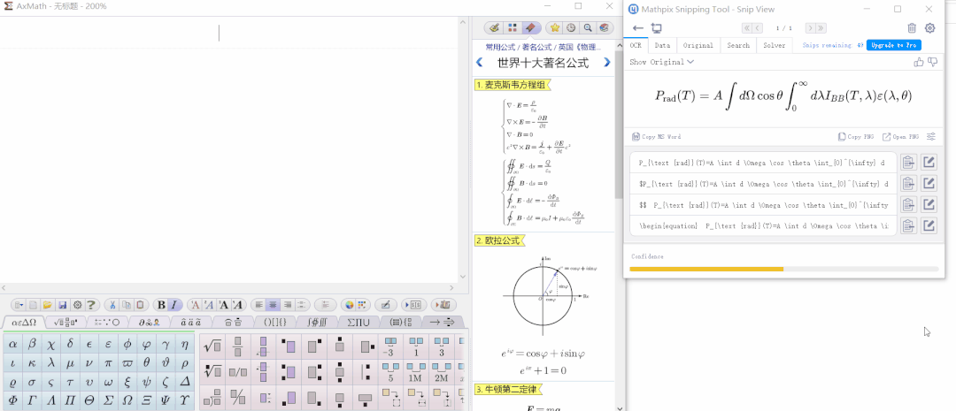 使用MathPix识别公式后虽然可以一键插入到Word中,但是只能以Word默认格式插入,对于一般的要求还需要再进行修改,并且无法进行连续编号。此时如果再搭配上AxMath就非常舒服了,彻底释放你的双手,告别手动输入并编号公式。点我查看Mathpix详细信息!除此之外还可进行LaTeX及公式互转,插入公式更随心所欲!