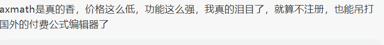 目前随着Axmath的不断更新,功能已逐步完善,买过后的小伙伴都说好用,免费版除了一些便捷功能限制之外,基本功能可正常使用。而注册版价格也才三十几块,并且永久授权,永久更新!相比国外某工具一年几百块来说真的很良心了,毕竟在价格能接受的情况下谁不想用正版呢!现在可以通过直接扫码购买,比以前更方便!仅需38元即可获取终身授权的Axmath!目前购买Axmath赠送3天的极度OCR公式识别编辑,限时限量!