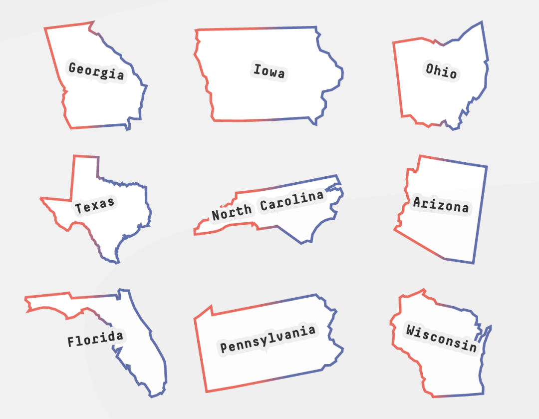 因为美国的选举制度,是由选举人团制度形成的间接选举,也就是对于各州普选票领先的一方,赢者通吃该州全部的选举人票。其本意是为了平衡大州和小州之间的不平衡。然而,这一制度导致的结果就是大部分的蓝州和红州对选情的影响不重要。选举胜负的关键就集中在一些所谓的摇摆州。