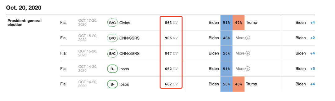 538网站列出的一组不同机构发布的针对弗罗里达州的民调结果,红框内为受访者人数,均在600到1000之间。比如女主播说,最新的民调显示,旺财跟小强的支持率是51%对49%,误差3%。那意思就是说旺财的支持率是从48%到54%,而小强的支持率是从46%到52%。小强也可能以52%对49%在选举中获胜。所以说2%的民调差距并不能确保旺财就一定在选举中获得胜利。现在拜登跟川普比在全国民调中领先9%-10%,如果按照现在的情况投票的话,误差容限(MOSE)是小于两者的民调差距。也就是说如果按照目前民调结果的话,即便考虑了误差的情况,拜登也能获得全国普选投票(popular vote)中的多数。当然,由于美国采取的是选举人团制度(electoral college vote),即便赢得了普选投票的多数,但是未能获得选举人团投票多数的话,也并不意味着拜登可以赢得选举。加权民意调查结果