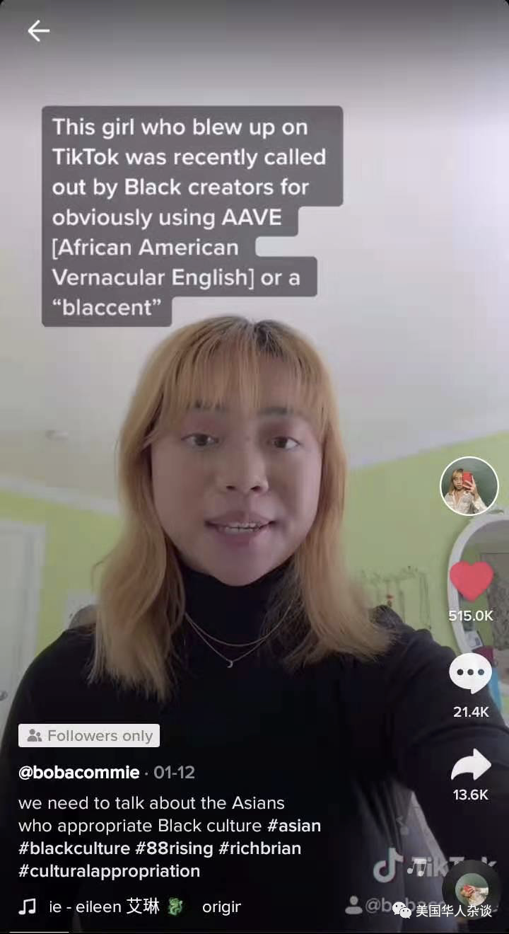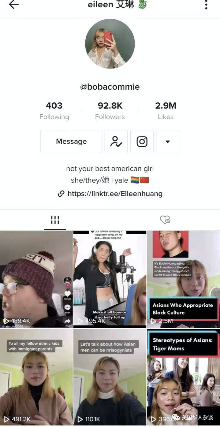 本文根据《美国华人杂谈》对黄艾琳的采访,及其在多个公共媒体上的发言整理而成。2020年6月,我因为微信上的那篇文章似乎人尽皆知。媒体采访纷涌而至,《纽约时报》、《南华早报》,还有美联社都曾采访我。我很开心微信的读者喜欢这些新颖的观点。然而,尽管大部分公众对我的公开信持开放态度,但网络上的回复里不乏语言暴力,现实中,骚扰和隐私泄露也随之而来。在我家附近,一些当地居民声称要对我的“诽谤”提起诉讼;有人联系耶鲁大学和实习公司,希望这些机构将我开除;有人四处张贴我母亲的手机号码,鼓励大家打电话“教育”我;还有人把我和朋友的照片发在网上……去年中,耶鲁大学的20岁的本科学生黄艾琳(Eileen Huang)在微信公众号《美国华人》发表了一篇引发华人社区激烈争议的文章,标题为:《我们和非裔站在一起--耶鲁华裔学生写给爸妈和华人社区的公开信》。在信中,黄艾琳谴责“亚裔美国人的沉默”,指出在亚裔存在歧视非裔现象”。黄艾琳呼吁华裔们应当与非裔站在一起,支持BLM(黑人命也是命)运动,共同与种族主义作斗争。因为这种批评和敦促,黄艾琳被右翼立场的一些华人指责为“被左派意识形态洗脑了”,“只知道政治正确”,“白上藤校”……在TikTok(美国版抖音)上,黄艾琳的帐号拥有9万多粉丝,算得上“顶流亚裔网红”。作为一位华裔女权主义者和反白人至上的“Z世代”(Gen Z)00后,在美国出生的年轻人中,对她支持和反对的声音同样也很多。《美国华人杂谈》隔着屏幕采访黄艾琳的时候,她房间果绿色的墙面就和我们在TikTok里看到的一样。
